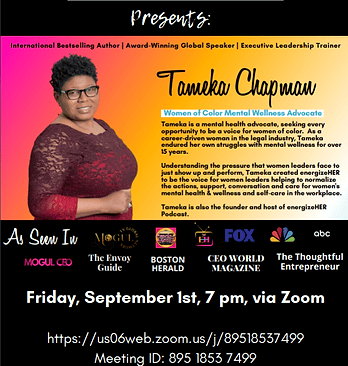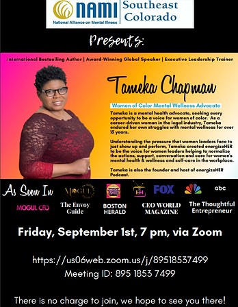 As a passionate advocate for mental wellness for women of color leaders, founder Tameka Chapman believes that our shared commitment to nurturing a supportive community can truly make a difference. This collaboration, energizeHER x NAMI Southeast Colorado, represents a significant step towards creating meaningful conversations and positive change in the lives of women.